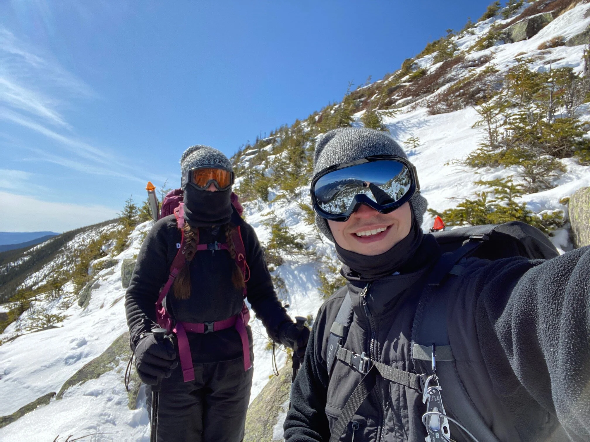 The trailhead for this hike is at the Cannon Mountain Aerial Tramway parking lot. If you are looking at the tramway building, there will be a service road to the left (it was plowed when we were here) - this is what you will follow to get to the trailhead. There is a small sign pinned on a tree that indicates that the trail is that way, though it can be easy to miss. You’ll walk along the service road for about 100 yards until you come to a clearing where you will see a sign that points to the Kinsman Ridge Trail and head into the woods. We opted to start in microspikes since the trails were frozen solid and hard packed. Immediately after starting the hike, you’ll begin gaining elevation very quick. The ascent will remain steep and utilizes several switchbacks to help with the steepest pitches. We found a few spots with some major sections of ice bulges, but nothing too difficult to navigate around. After about 0.7 miles of hiking, you’ll reach the bottom of a backcountry ski trail - the Kinsman Glades. This makes the hike really interesting because for the next 0.4 miles or so you will cross the ski route several times and have some nice views to the north though the trees. Make sure to watch out for any incoming skiers! We found this part of the hike to definitely be a bit sketchy because you will traverse the open glades several times and one slip could easily send you sliding down. At the top of the glades, the trail goes left back into the woods (watch for the blue blaze) and starts to climb more moderately than the previous sections. As the trees become much shorter, you’ll see a side path that leads to an excellent viewpoint of Franconia Ridge. We felt like we could reach out and touch the peaks that’s how close they were! From here, you can also look up and see the summit tower which is your next stop. The trail dips slightly into some scrub before climbing moderately over some semi-exposed ledges (which have awesome views). Soon you will come to a junction with the Rim Trail, which you can turn right on to and take towards the tower. On the way, you’ll pass the tramway station and head up the ski slopes very briefly before taking a left into the trees towards the tower. The lookout tower has incredible 360 degree views and is fully exposed to the wind, which was fierce on this day, so we were glad to have our faces protected! After the tower, we headed down to the tramway station to warm up, have lunch (their soup is delicious!), and relax before heading back down. The first part of the descent isn’t too bad, but once you’re back at the top of the glades, the steep terrain can be a bit sketchy to descend on - especially when it is icy! We used our ice axes on this decent rather than our poles, as they gave us much more confidence and made us feel safer as we made our way down. It also made for some amazing butt sledding because we could use our ice axes to slow us down so we didn’t barrel off the trail or hurt ourselves. Overall, this was a really enjoyable hike and the opportunity for butt sledding made the steep descent very quick! This trip to Cannon makes Winter #14 for us!