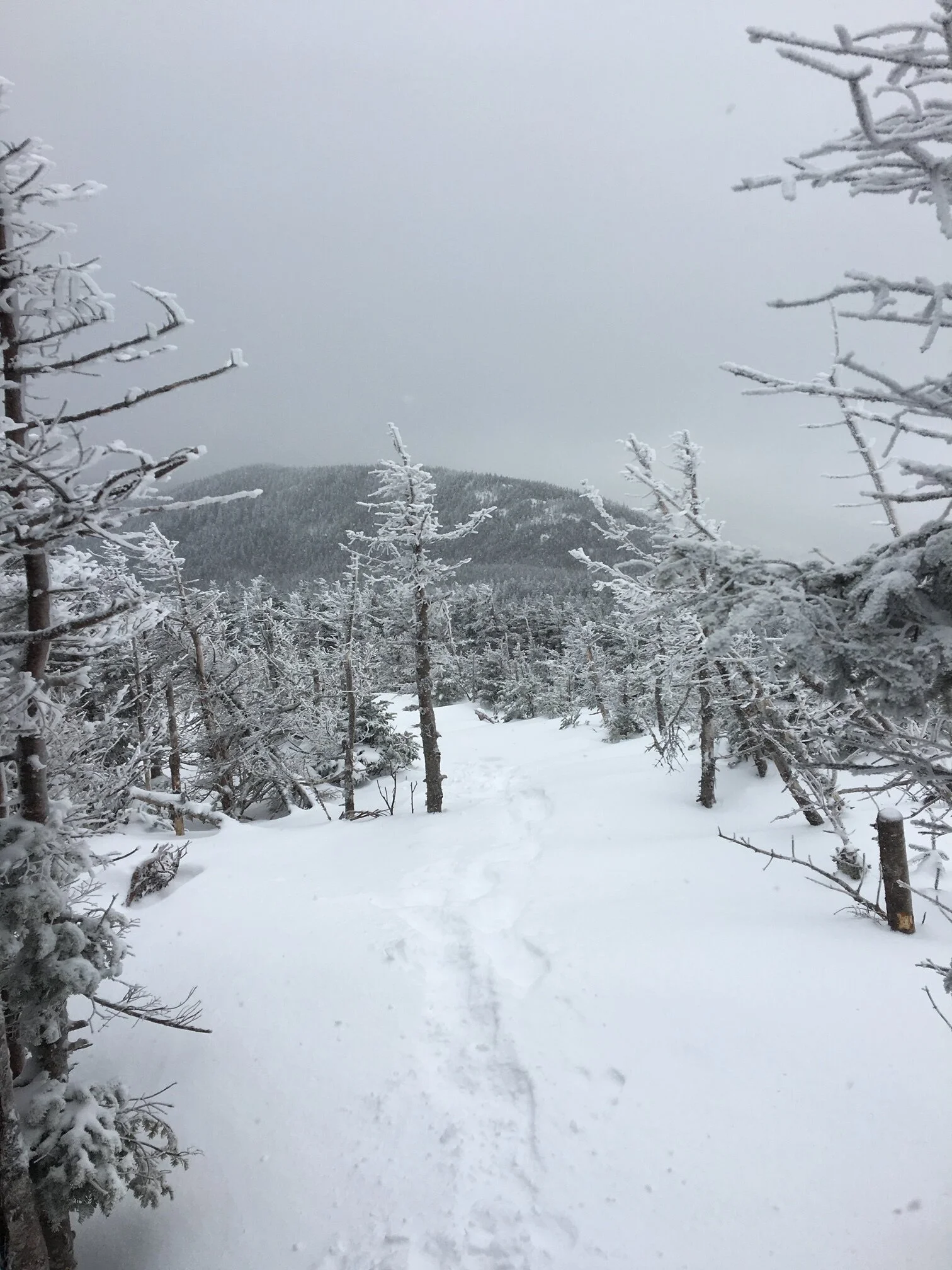 After a nice break, continue along the Kinsman Ridge Trail for another 0.9 miles and you’ll reach the summit of South Kinsman. Coming off of North Kinsman, the trail descends steadily into the col and climbs moderately up to the summit of South Kinsman. Along the way, there are several fine views that you can see through the scrub or by going down spur paths. The summit of South Kinsman is bare and open, offering fantastic views. Unfortunately for us, it was completely in the clouds when we were here. To descend, go all the way back following the same route you used to ascend. The descent from North Kinsman back to the junction is steep, so use caution. The descent down the Mt. Kinsman Trail is very moderate and should allow for a quick descent. It was a great day for Winter 48 numbers 4 and 5 for us!