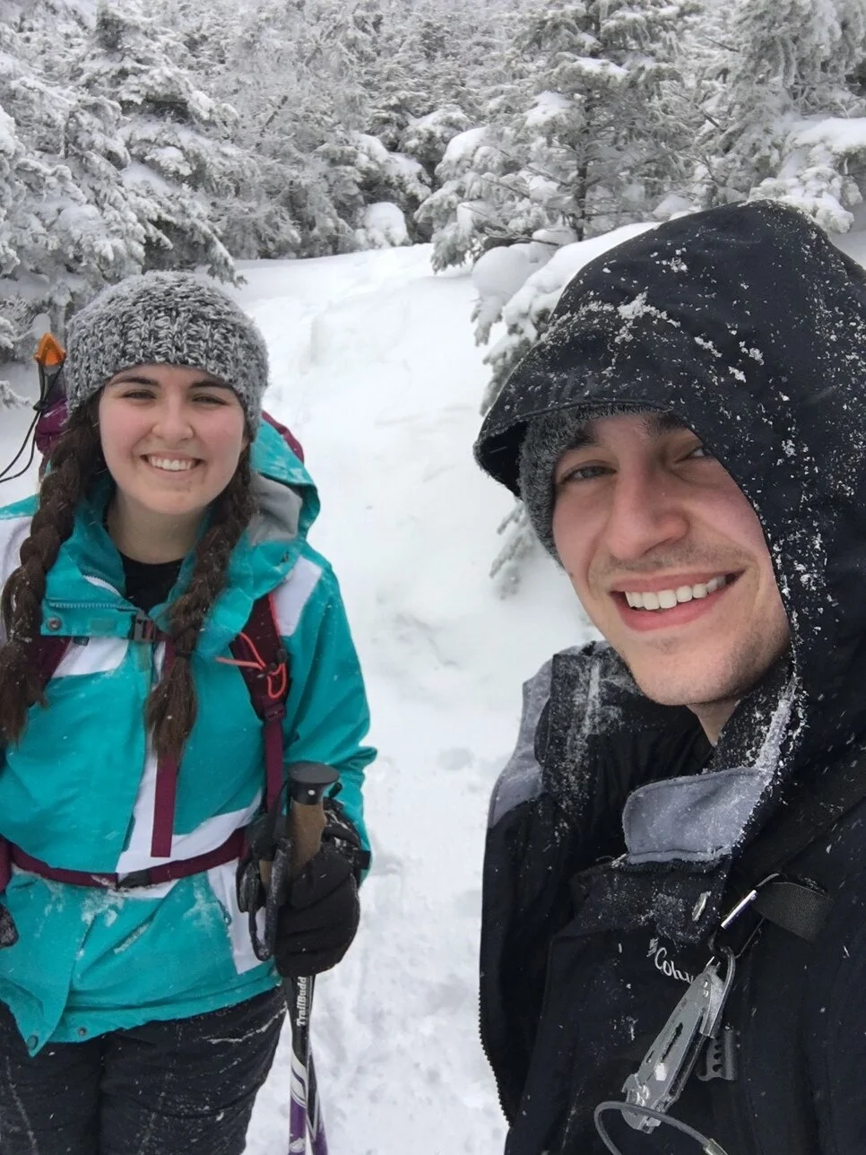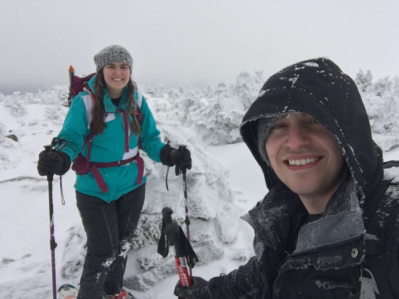 Trail Summary: We chose to hike the Mount Kinsman Trail to the summits since the Fishin’ Jimmy Trail has a reputation as a brutal route, with lots of ups and downs and steep sections. The Mount Kinsman Trail allowed us a much more leisurely and enjoyable approach. This route is less common in the winter, so you may find yourself having to break trail if it has snowed recently (this was the case for us). The trailhead parking lot is off of NH 116; it is not always going to be plowed, so a 4WD vehicle is recommended. When we went, there was a decent amount of snow in the lot. Since Adam has a Jeep, this wasn’t an issue for us. But for smaller cars, it may pose a challenge depending on the conditions. For a winter hike, this is a great route. You are protected most of the way, but once you get to Kinsman Ridge Trail you’ll be much more exposed to the elements, so proper gear is recommended. We wore our snowshoes the entire time as there was fresh snow (snowshoes are something you should always carry with you in winter). The Kinsman Ridge Trail has a few steep sections that require care, but nothing too crazy. There were a lot of snow drifts on the Ridge due to the wind, so that is one thing that you will most likely encounter. The wind can be very fierce and with wind chills, it can get very cold very quick. Always wear extra layers and face protection!